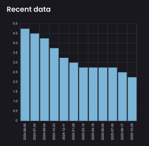 On October 29, 2025, the Bank of Canada announced it was cutting its overnight lending rate to 2.25%, a 25 basis point reduction.